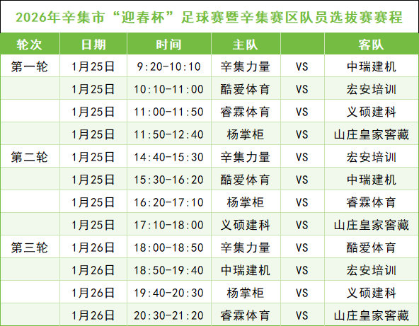 北京时间1月21日凌晨U23男足亚洲杯半决赛中国队3比0战胜越南队历史首次晋级决赛!这不仅是一场胜利更是中国足球一次振奋人心的飞跃!U23赛事强劲赋能“河北五超”联赛激战正酣辛集众多草根球员热血沸腾、跃跃欲试渴望上场一展身手机会来了!1月25日2026年辛集市“迎春杯”足球赛暨辛集赛区队员选拔赛即将激情开赛!本次比赛采用五人制足球赛制让本土足球爱好者齐聚赛场...